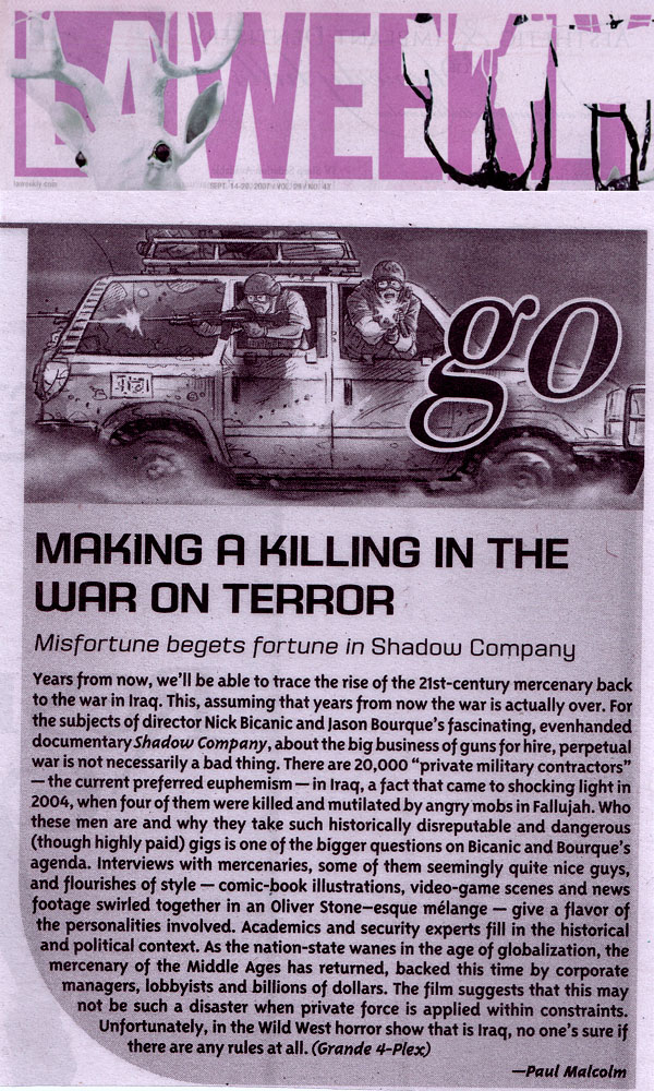 'Fascinating, evenhanded documentary about the big business of guns for hire. Flourishes of style — comic-book illustrations, video-game scenes and news footage swirled together in an Oliver Stone–esque mélange — give a flavor of the personalities involved while academics and security experts fill in the historical and political context.' - LA weekly pick of the week