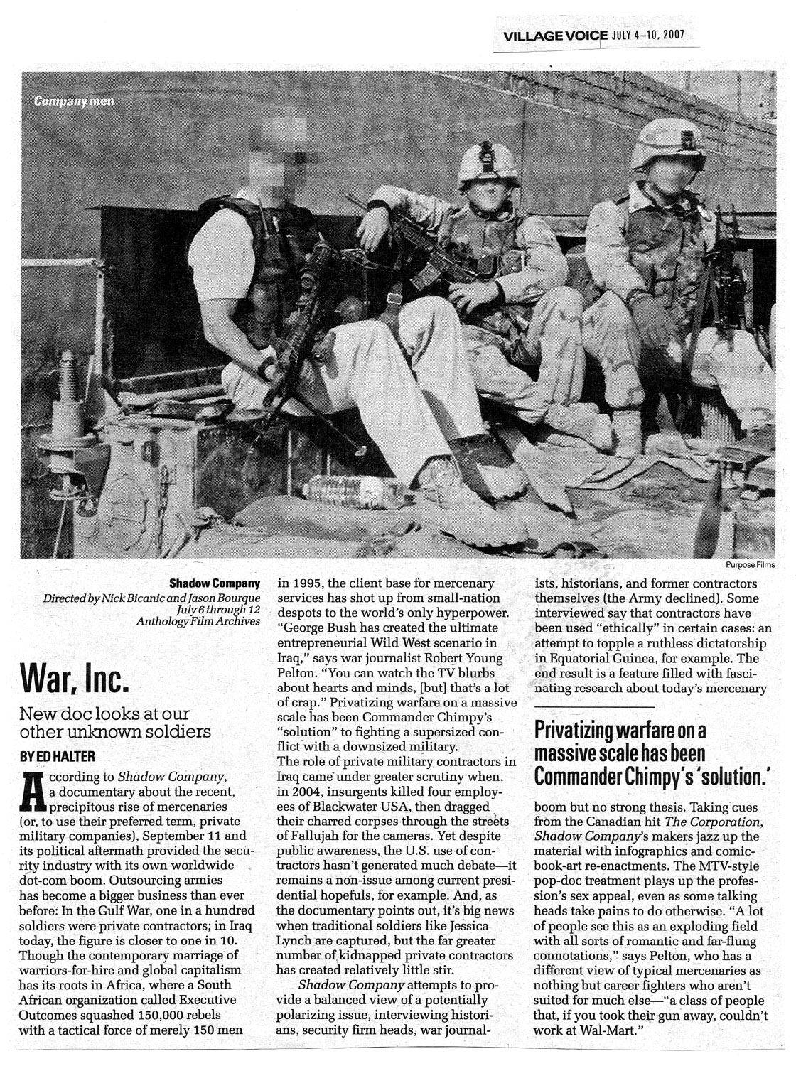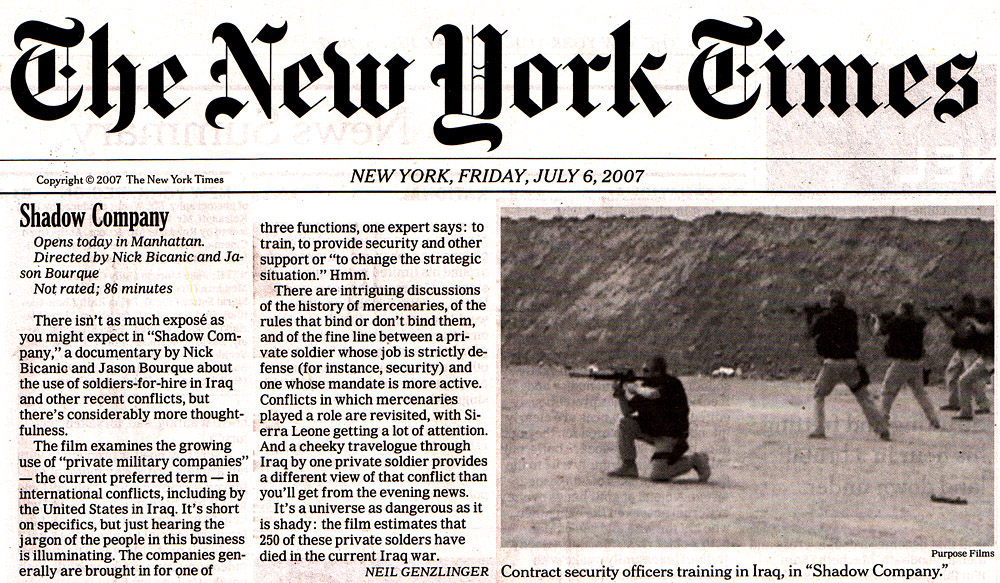 "Shadow Company is a must-see film for anyone who is concerned about our military and our security being privatized."